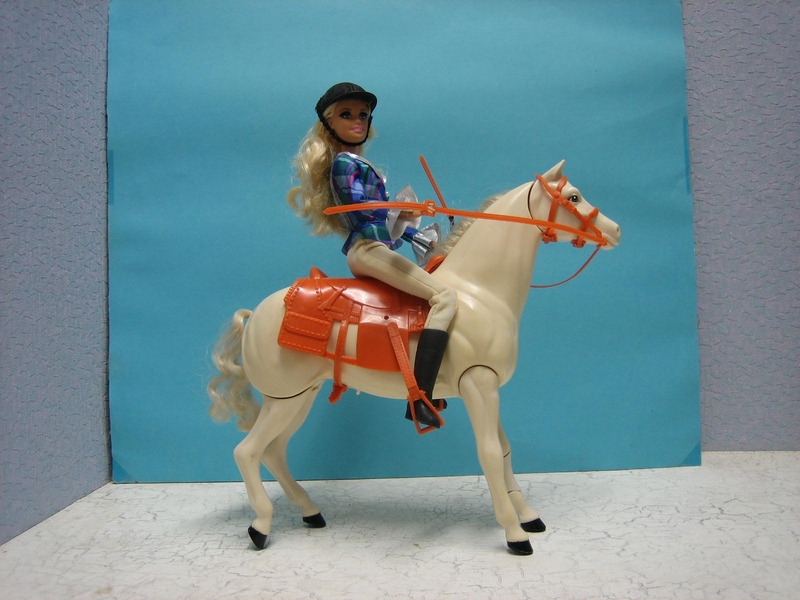 Paardrij barbiepop op paard met galop geluidPrachtige Barbie met wimpers op paard die een galop geluid maakt en hinnikt als 1 been naar voren word bewogen. In goed werkende conditie. batterijklep zit op de onderkant van het paard.