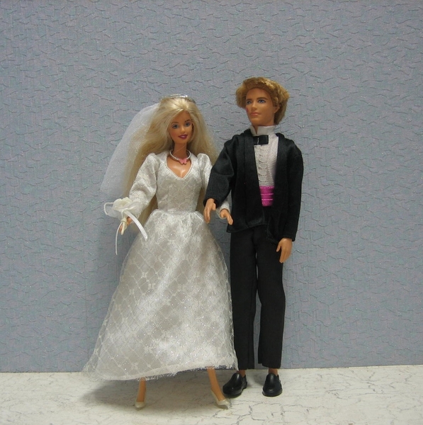 Barbie en Ken gaan trouwen [POP161]Barbie en Ken gaan trouwen met bruidstaart en een taartschep en een bijzettafel. Barbie draagt parelmoer hakjes en haar benen en armen kunnen buigen. Uit een rookvrije en diervrije omgeving.