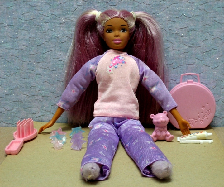 Dreamglow Barbie AA 2001 Mattel slaap Barbie zeldzaam [POP222]Dream Glow barbie AA uitgegeven door Mattel 2001 inclusief een paar haarclips, originele tandpasta, tandenborstel, beer, koffer, borstel.